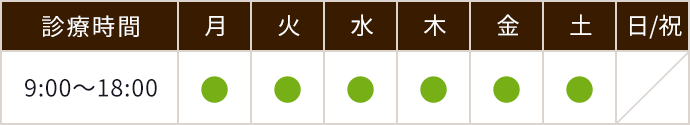 | 診療時間 | 月 | 火 | 水 | 木 | 金 | 土 | 日/祝 |